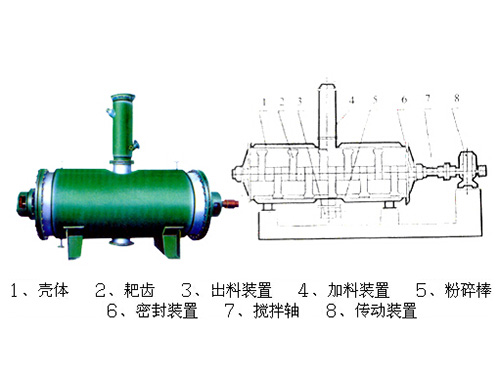 真空耙式干燥機具有結構簡單,操作方便,使用周期長,性能穩(wěn)定可靠,蒸汽耗量小,適用性能強,產品質量好,特別適用于不耐高溫、易燃、調溫下易氧化的膏狀物料的干燥,該機經用戶長期使用證明是一良好的干燥設備。原理:被干燥物料從殼體上方正中間加入,在不斷正反轉動的耙齒的攪拌下,物料軸向來回走動,與殼體內壁接觸的表面不斷新,受到蒸汽的間接加熱,耙齒的均勻攪拌,粉碎棒的粉碎,使物料表面水分有利的排出,氣化的水分經干式除塵器、濕式除塵器、冷凝器,從真空泵出口處放空。
